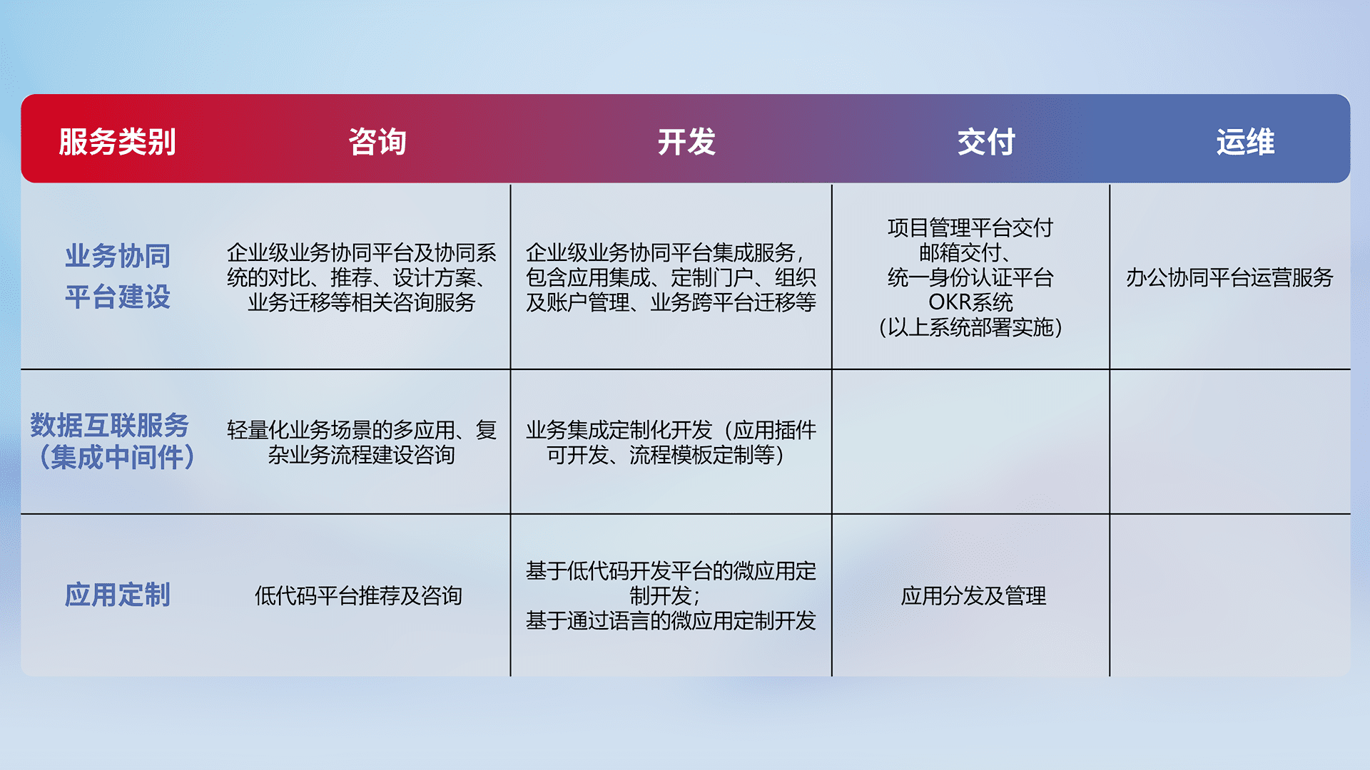 针对钉钉、、、、企微、、、、IDaas等平台级产品提供产品的规划、、、方案、、、交付、、、定制化开发等服务,,实现如统一协同办公、、、、智能客户服务、、混合会议管理、、智能数据查询、、等业务场景,,,,实现数字化转型。。。。